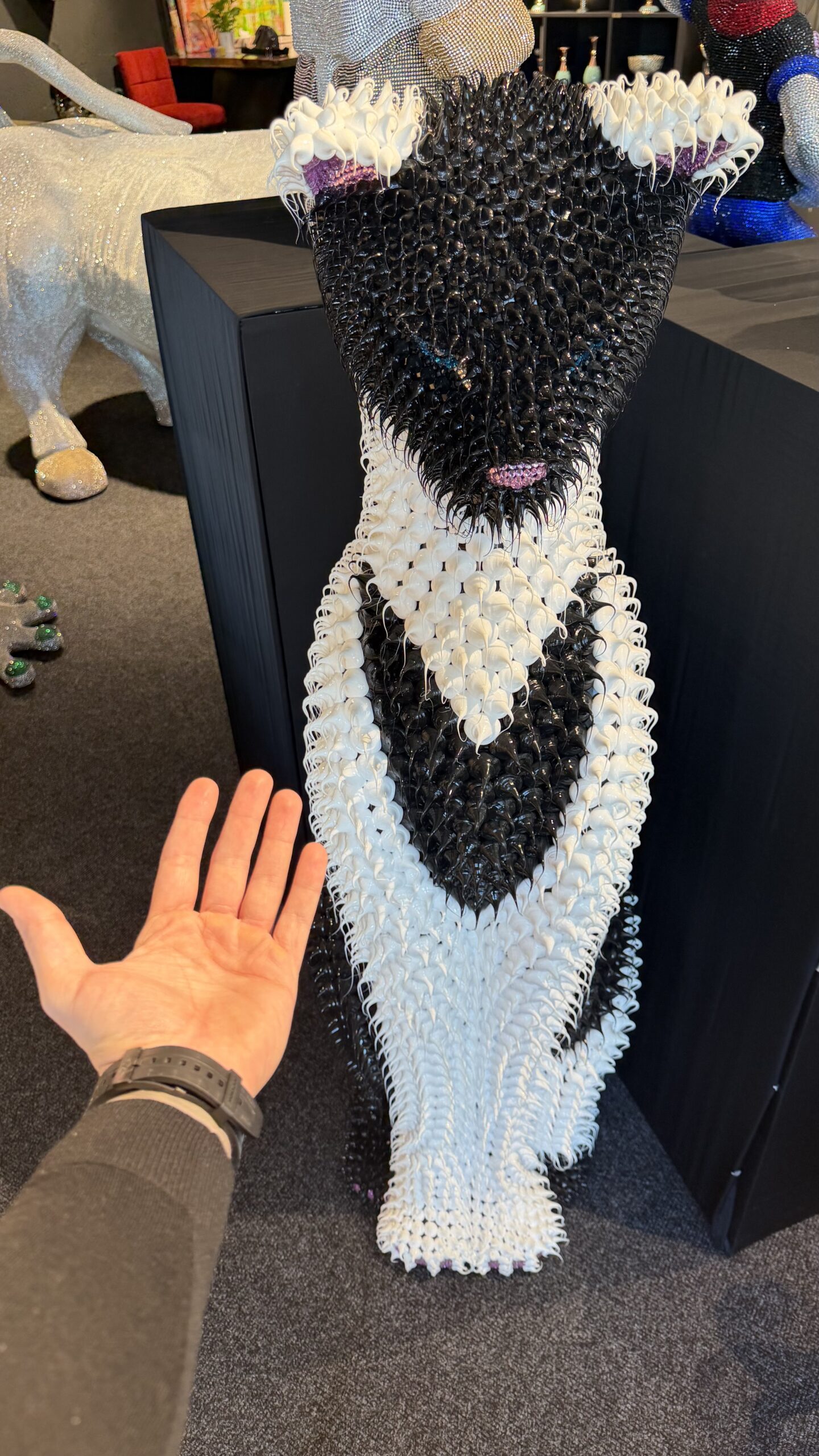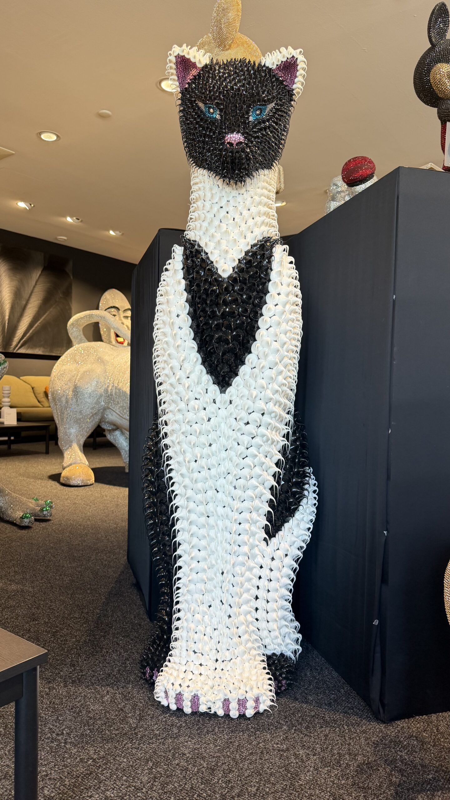 Außergewöhnliche und hochwertige Katzen-Designskulptur im modernen Pop-Art-Stil, vollständig mit glänzenden Kristallelementen veredelt. Dieses imposante Kunstobjekt überzeugt durch seine elegante Form, kontrastreiche Farbgebung und luxuriöse Ausstrahlung.
