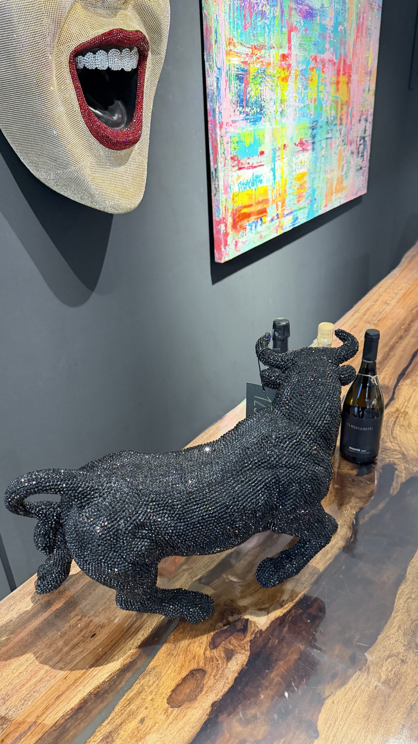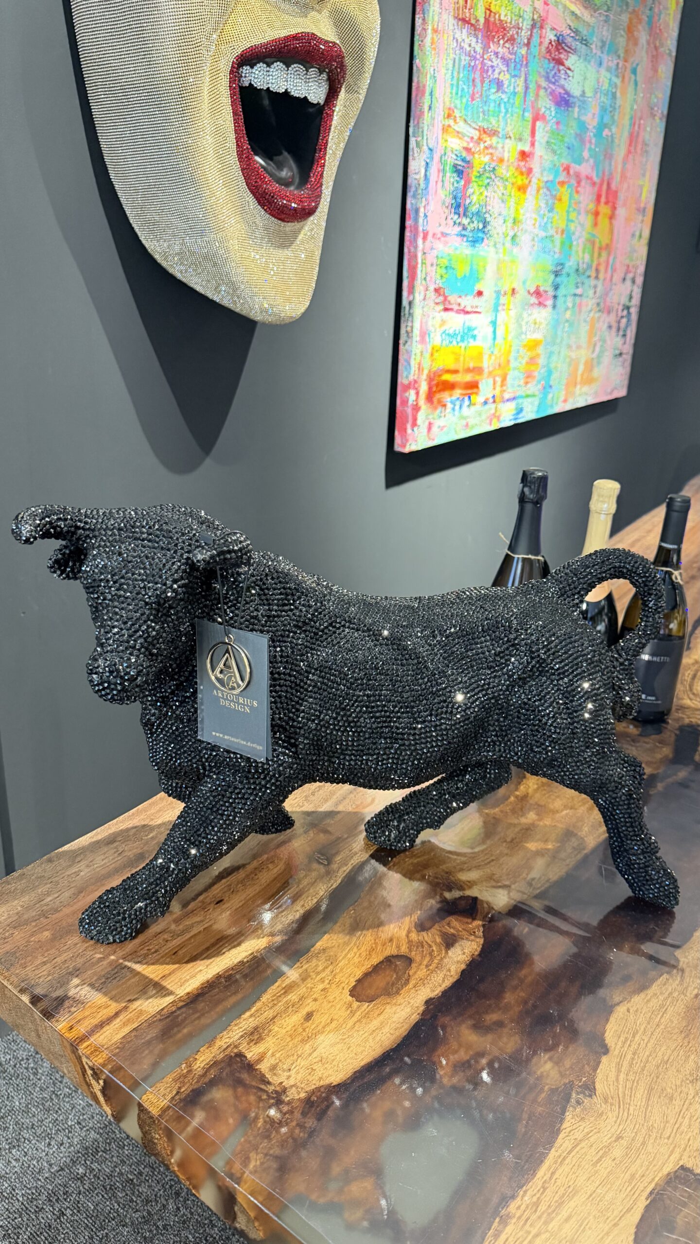 Beeindruckende und hochwertige Stier-Designskulptur, vollständig mit funkelnden Kristallelementen veredelt. Dieses kraftvolle Kunstobjekt symbolisiert Stärke, Energie und Eleganz und setzt ein markantes Statement in jedem Raum.